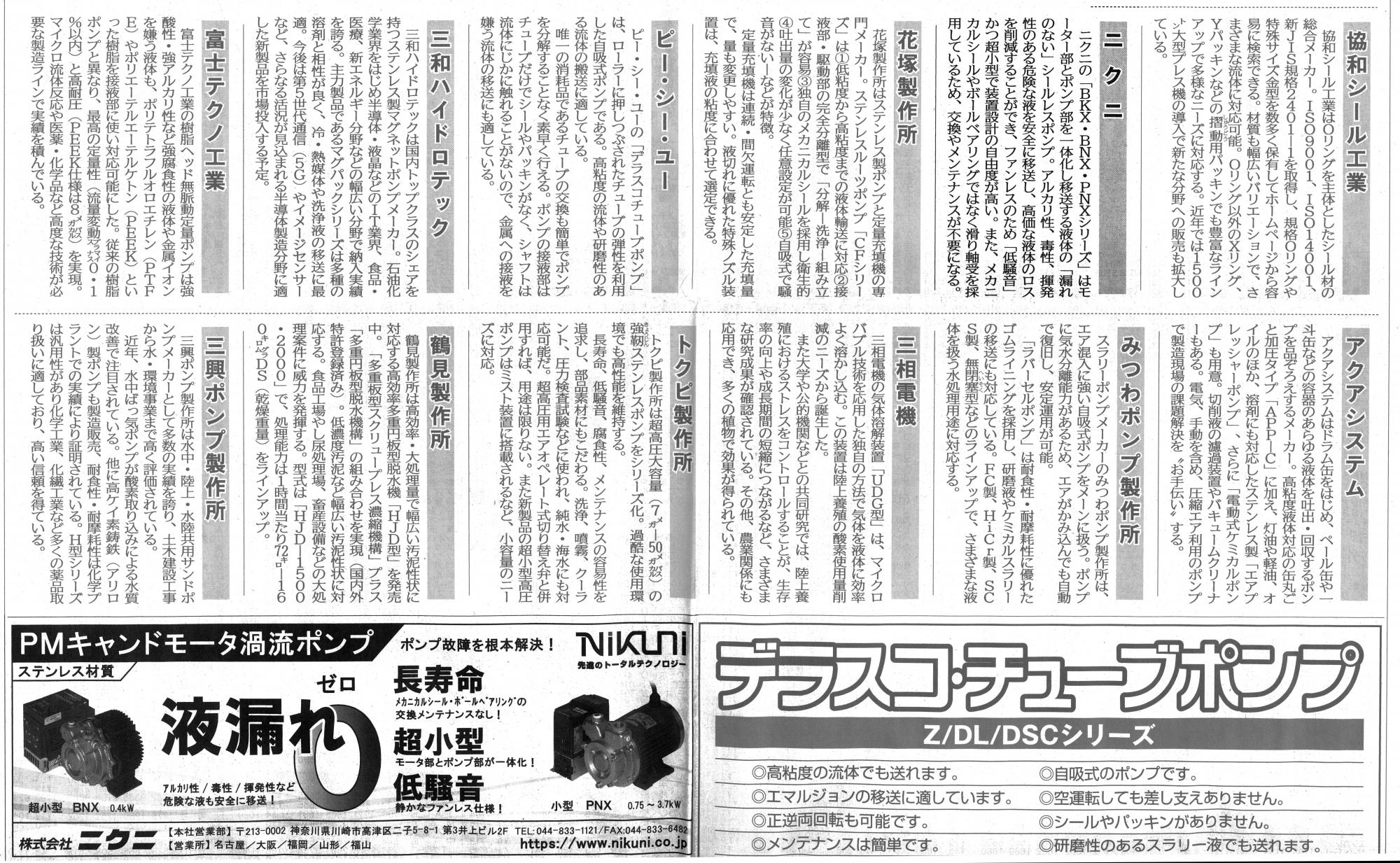 ■ 月刊 ホテル旅館 ホテル、旅館等、宿泊業に従事する方のための専門誌 設備・装置から食事、ホスピタリティに至るまでの情報を網羅 →公式サイトはこちら 横浜ベイコート倶楽部ホテル&リゾート/ザ・カハラ・ホテル&リゾート横浜様 にご導入頂きました。 ホワイトイオンバス の記事については コチラ ■ 低 CO2 川崎ブランド 川崎市がライフサイクル全体を通して CO2 がより削減された製品を認定する事業 →公式サイトはこちら 当社としましても積極的に環境にやさしい製品を開発に取り組んでおり、この度、マイクロバブルジェネレータが「低CO2川崎ブランド’19」に認定されました。 詳細はこちら ■ 月刊 メカトロニクス エンジニア向け生産財情報誌 公式サイトはこちら ■ 日刊工業新聞 創刊100年を迎える産業総合誌 >記事掲載:ポンプ特集2020