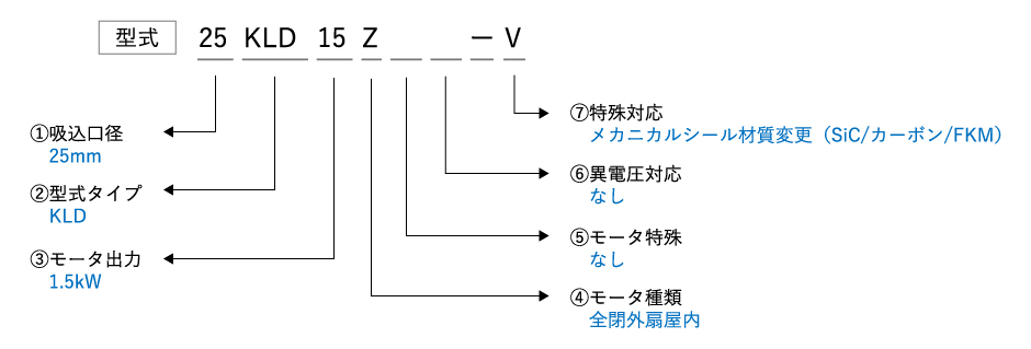 - | J = メカニカルシール材質変更 (SiC/カーボン/PTFE) T = 特殊対応 U = 特定ユーザー向け特殊対応 V = メカニカルシール材質変更 (SiC/カーボン/FKM) :