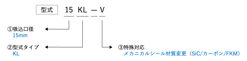 - | J = メカニカルシール材質変更 (SiC/カーボン/PTFE) T = 特殊対応 U = 特定ユーザー向け特殊対応 V = メカニカルシール材質変更 (SiC/カーボン/FKM) :