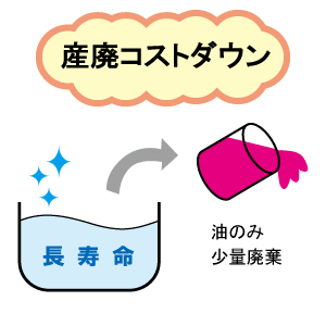 腐敗防止により、水溶性クーラント液・洗浄液の寿命が延びるので液交換頻度が減り、産業廃棄の量を減らす事ができます。