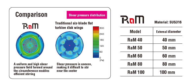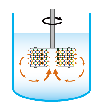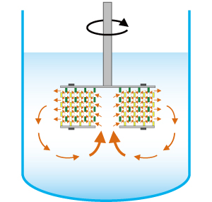 Due to the flow that sucks in from the lower part of the shaft center and discharges outward, the entire container can be stirred evenly.