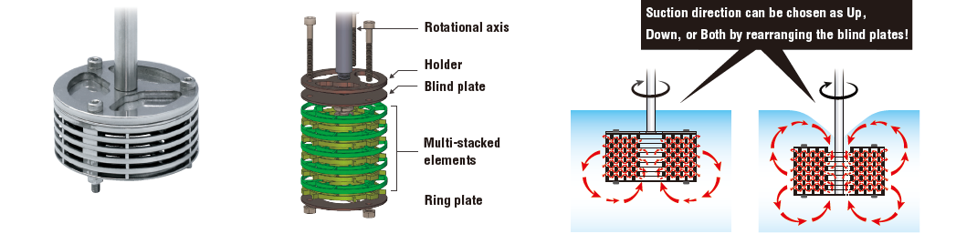 By changing the installation position of the blind plate, the suction direction can be altered.This allows for various types of mixing, such as particle lifting and gas entrainment